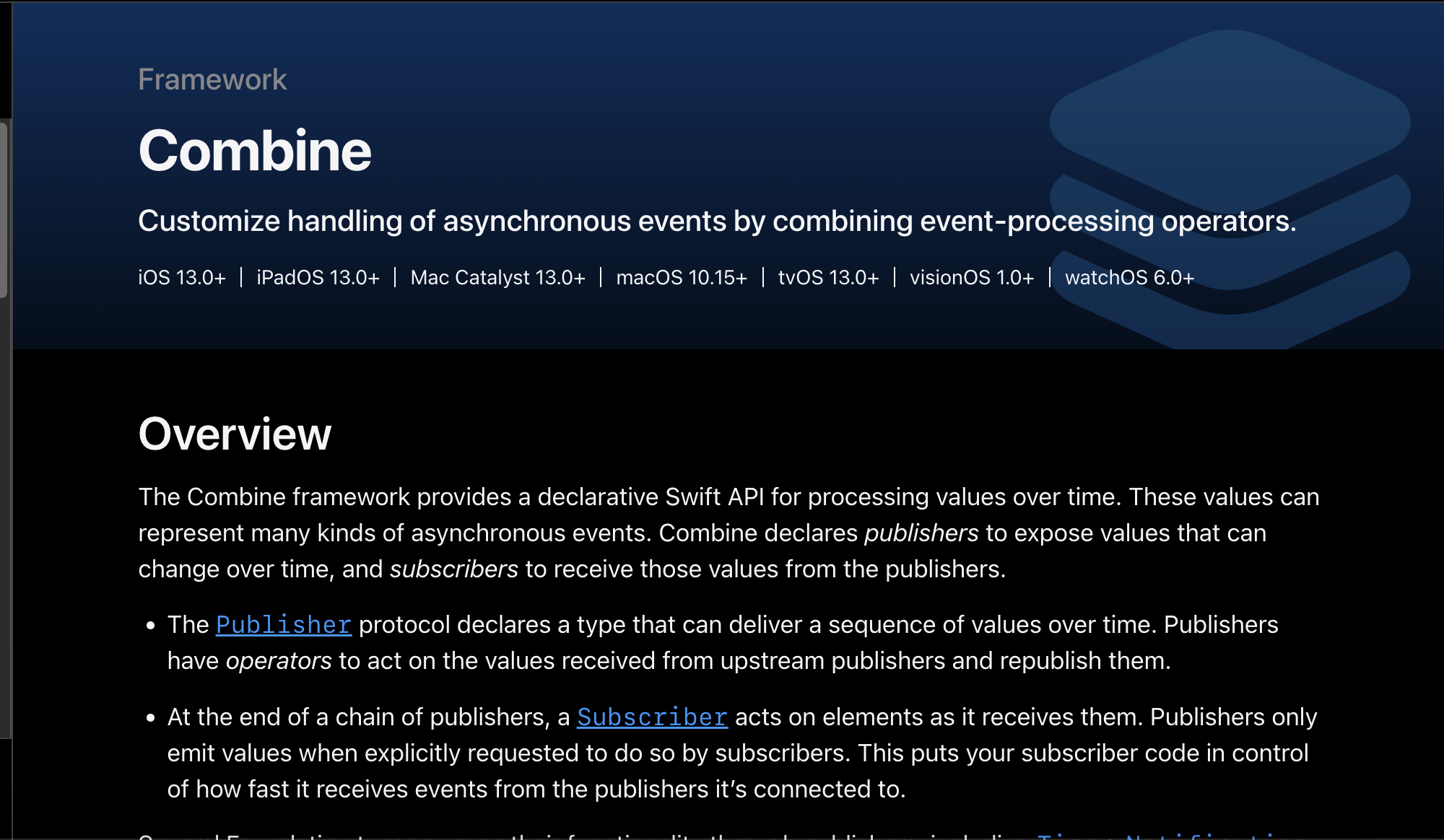 Combine 프레임워크는 시간에 따라 변하는 값을 처리하기 위한 선언형 Swift API를 제공합니다. - These values can represent many kinds of asynchronous events.
